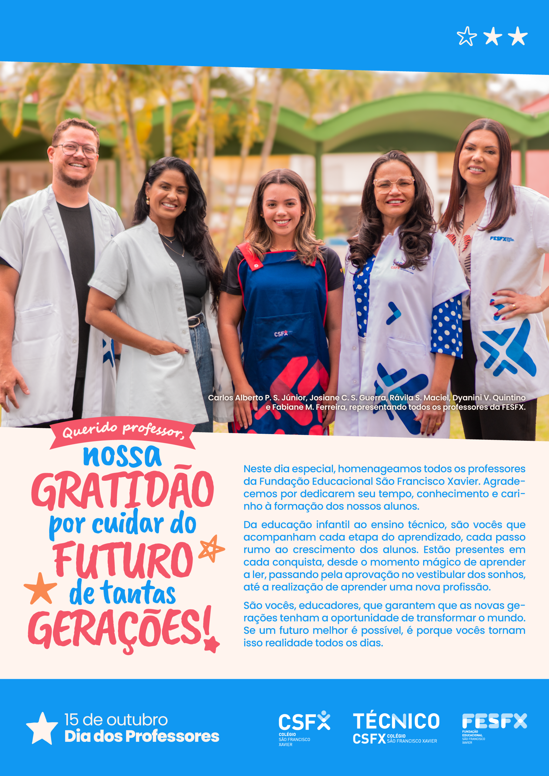 Neste dia especial, homenageamos todos os professores da Fundação Educacional São Francisco Xavier. Agradecemos por dedicarem seu tempo, conhecimento e carinho à formação dos nossos alunos.